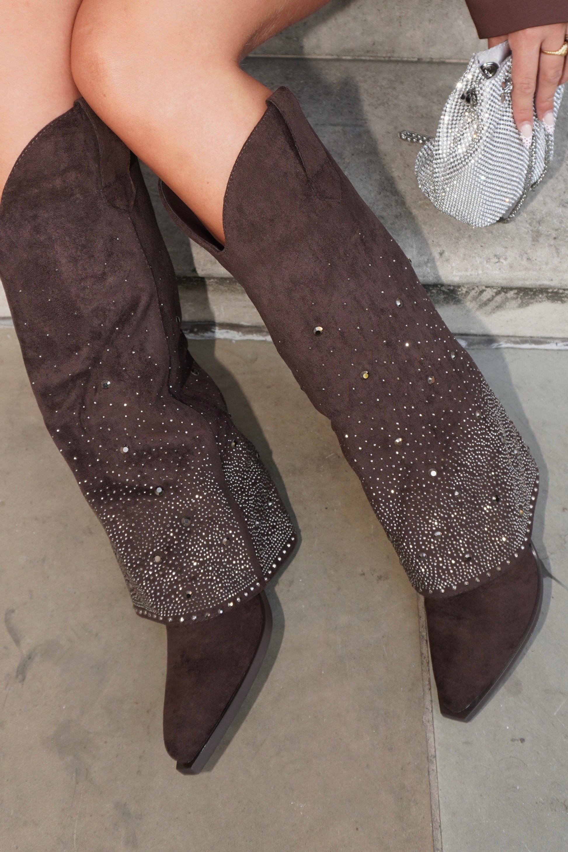 Bottes hautes en finition suédine avec revers et strass façon santiags. Talon bloc pour un porté confortable. Silhouette affirmée, faciles à associer aussi bien avec un bermuda décontracté qu’avec un blazer pour un look plus habillé.